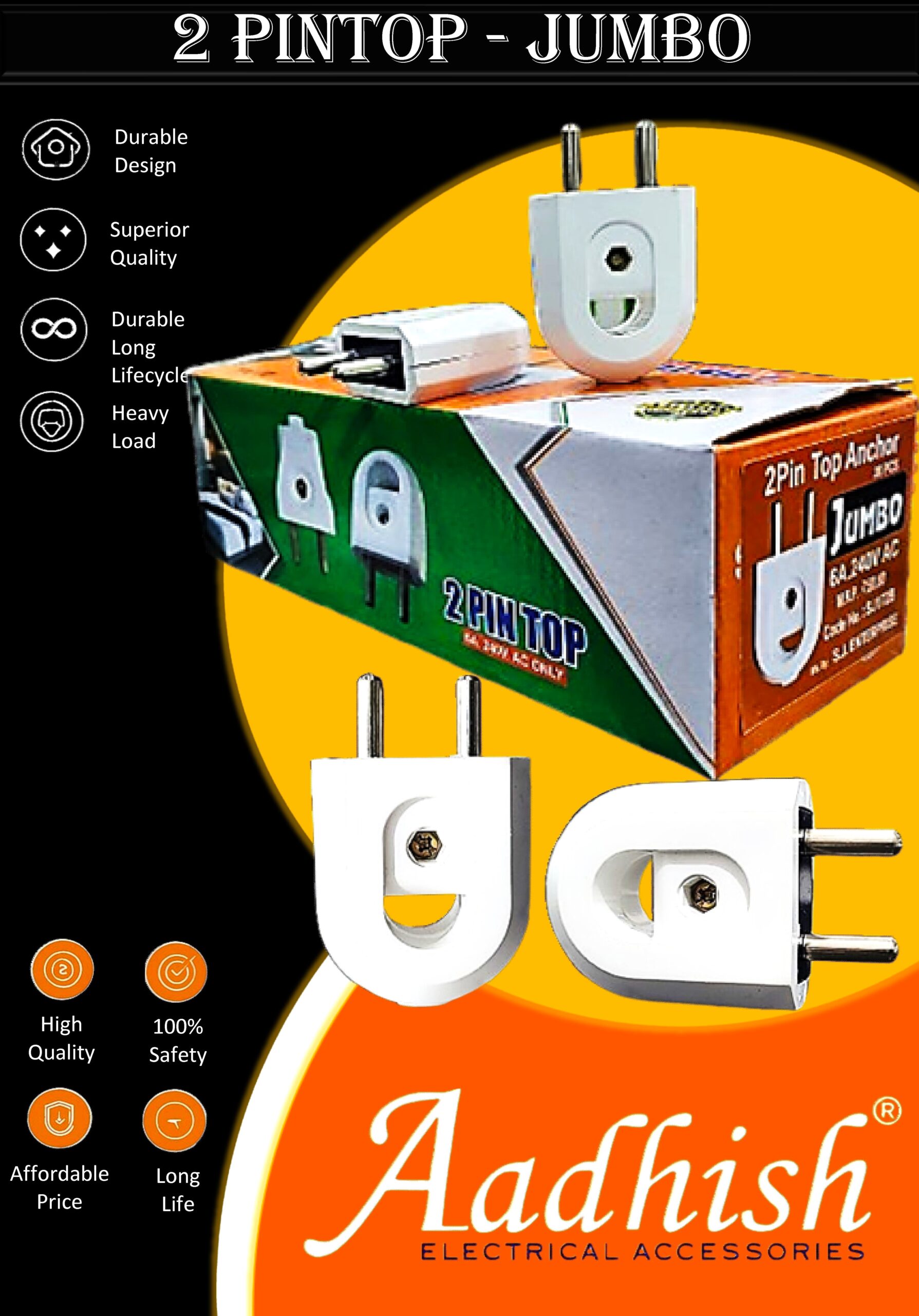 A 2 Pin Top is a common, basic electrical plug with two round prongs, used for low-power devices like fans, lamps, or phone chargers, fitting into sockets in regions like India, Europe (Type C), and other areas with non-grounded outlets, providing simple live and neutral connections for safe, everyday appliance use.